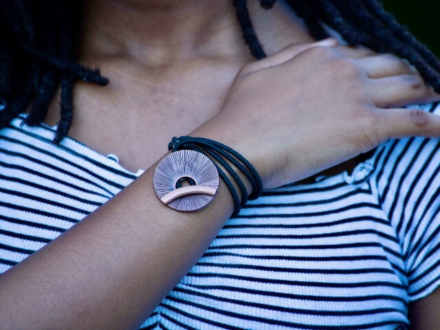 This Striking Copper Blast Handmade Hair Tie can also be worn as a headband, necklace and bracelet.
